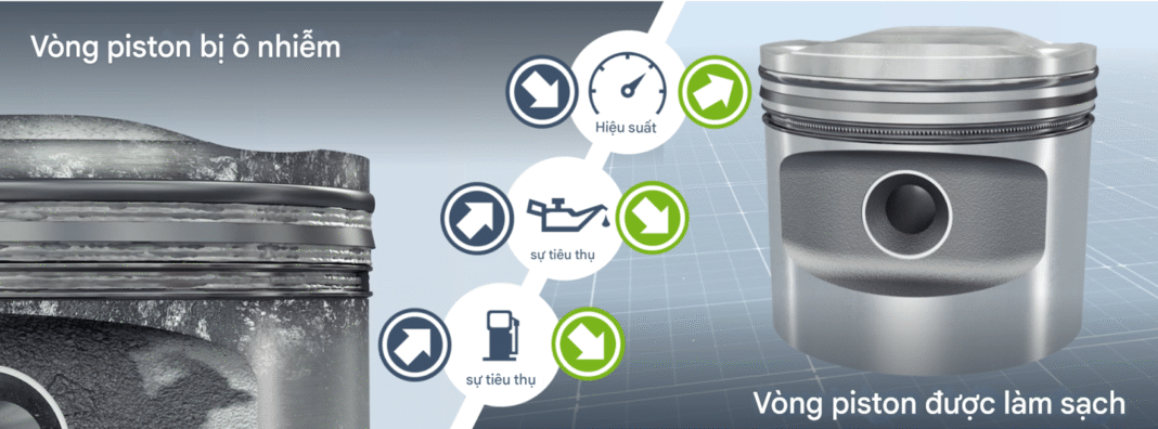 - ✔ Giải phóng vòng piston bị kẹt: Các vòng piston bị dính hoặc kẹt được giải phóng hiệu quả, giúp giảm đáng kể lượng dầu tiêu thụ.